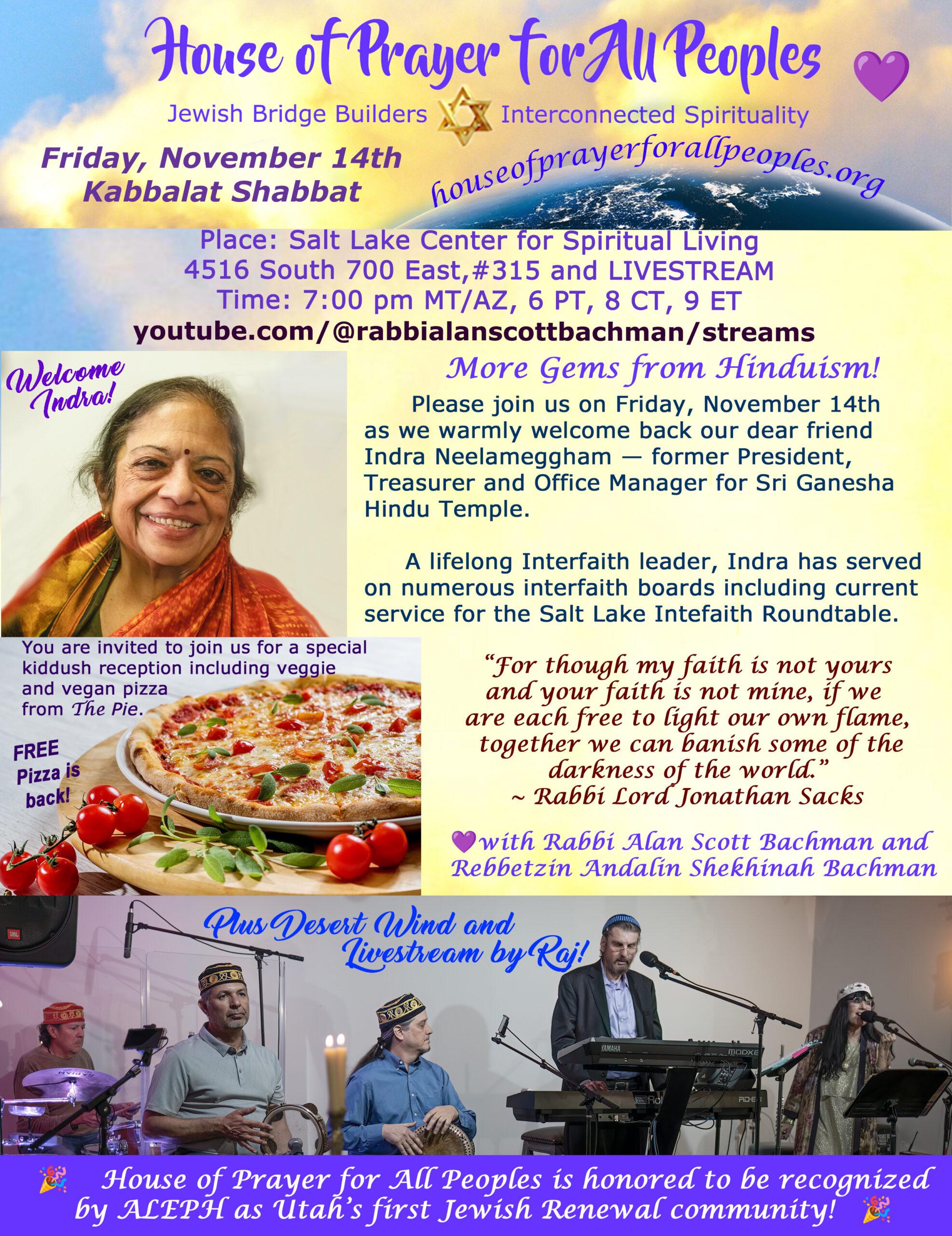 Join House of Prayer for All Peoples for Kabbalat Shabbat: More Gems from Hinduism — welcoming back our dear friend Indra Neelameggham 🌺